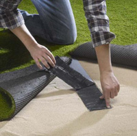 Bij deze stap, sla je het kunstgras weer op en leg je de tape onder de naad.Vervolgens leg je het kunstgras terug en druk je het op de naad aan.